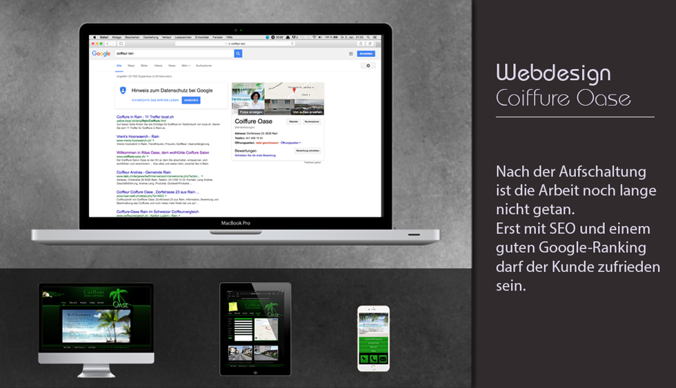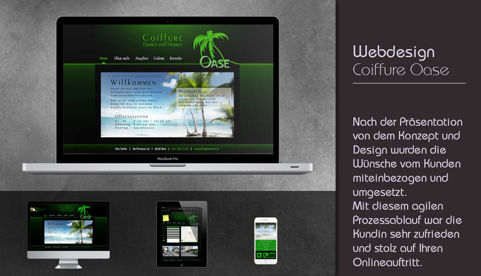 In der heutigen Zeit ist ein Internetauftritt ein Muss. Für den Coiffure Salon Oase wurde somit eine übersichtliche, benutzerfreundliche Website erstellt.